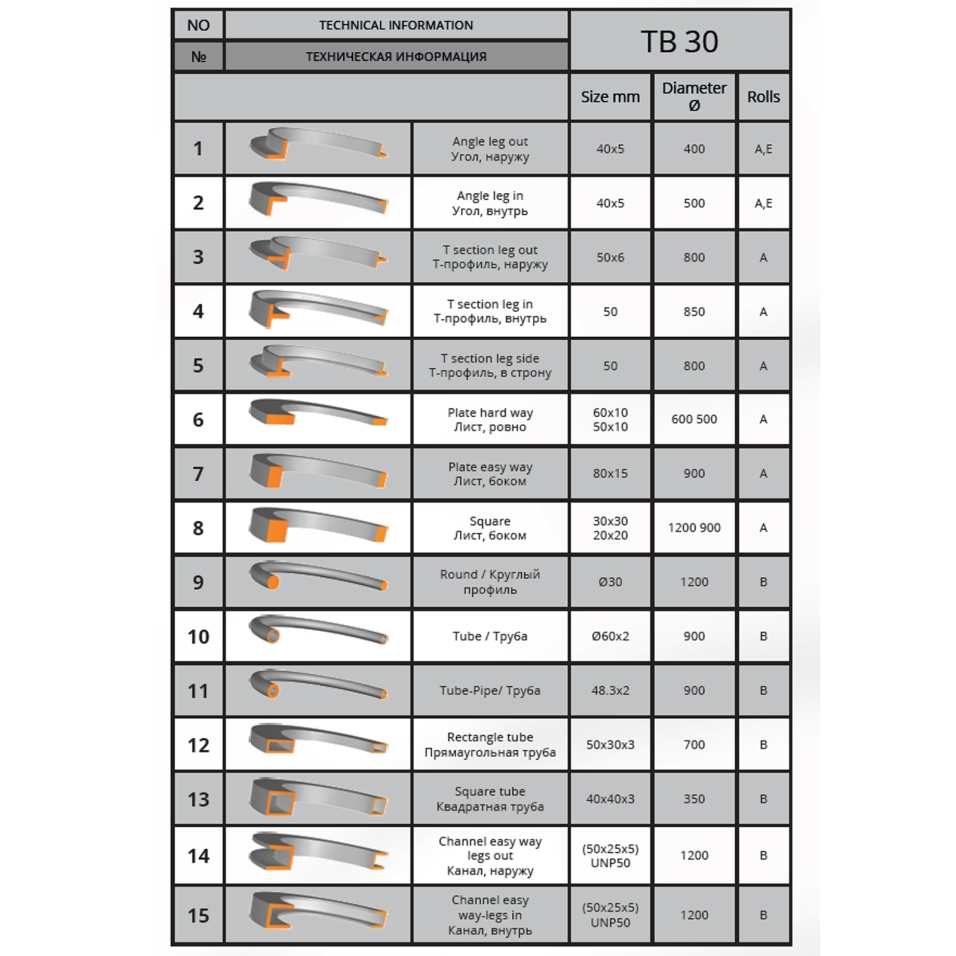 Cintreuse TB 30 : Travail horizontal/vertical, galets motorisés, pédale séparée. Options : afficheur numérique, vitesse variable et galets pour tubes.