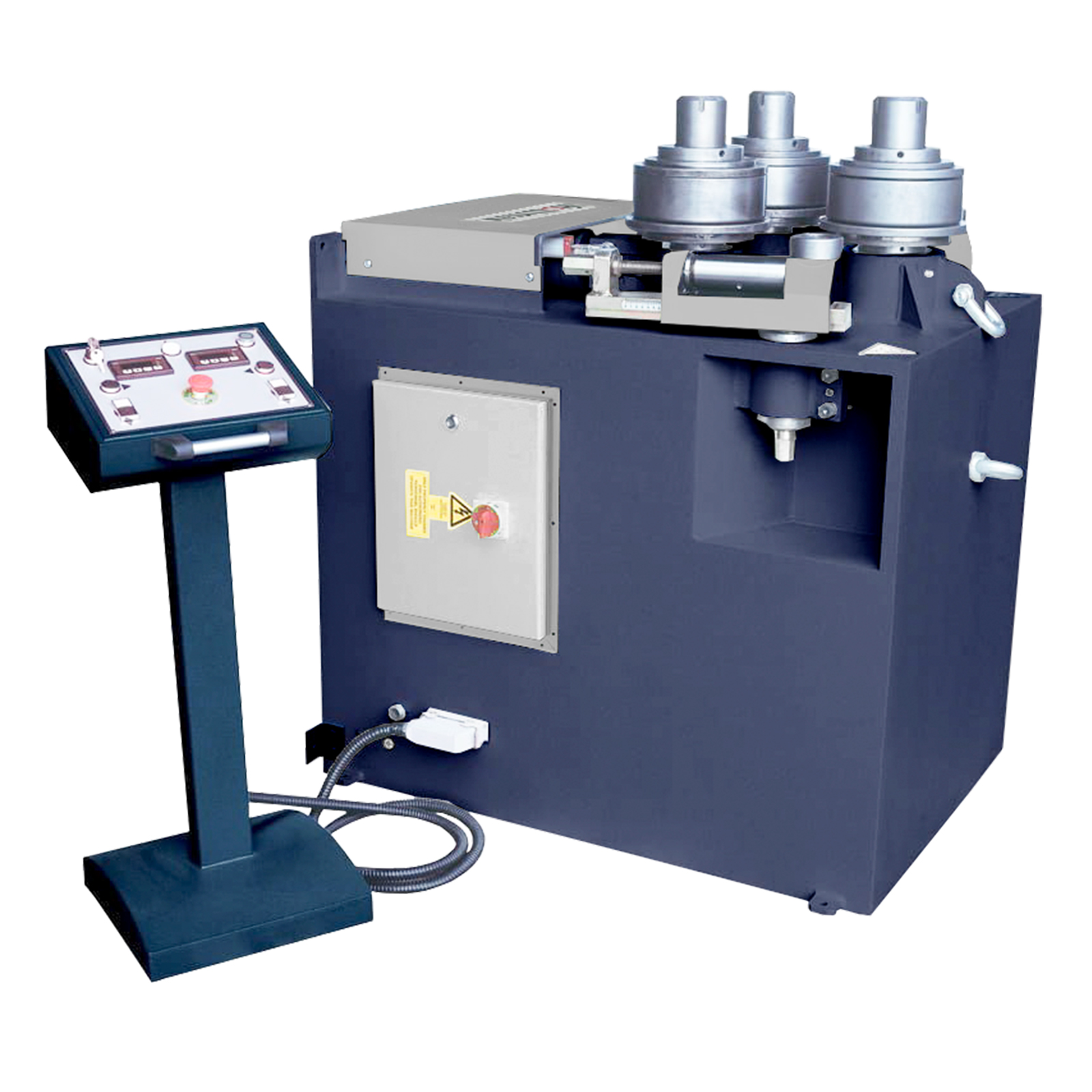Cintreuse hydraulique TBH 100. Bâti acier, 3 galets motorisés. Travail horizontal/vertical. Options : Commande NC, guides hydrauliques, cintrage spirale.